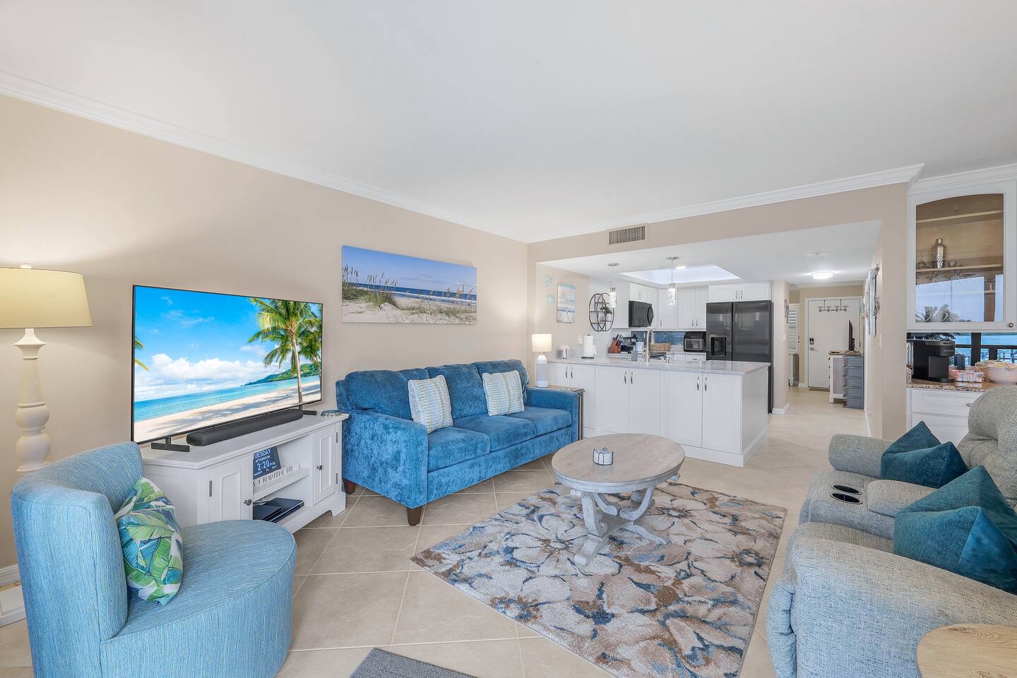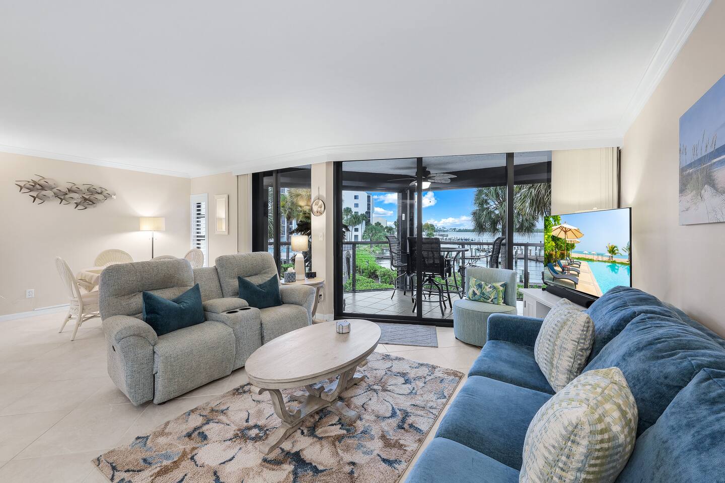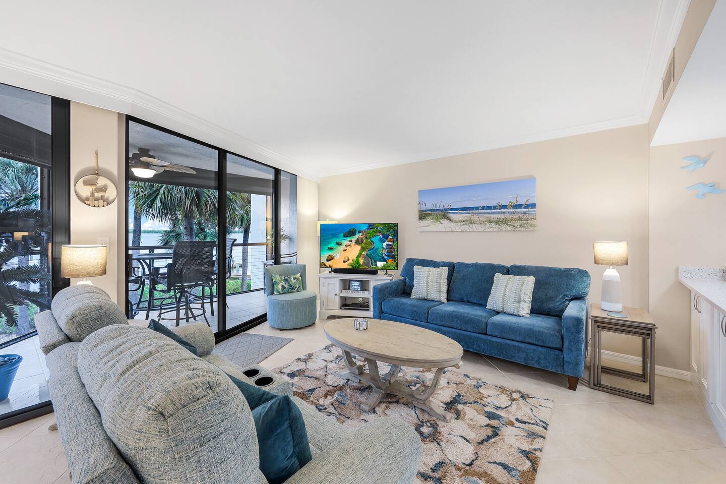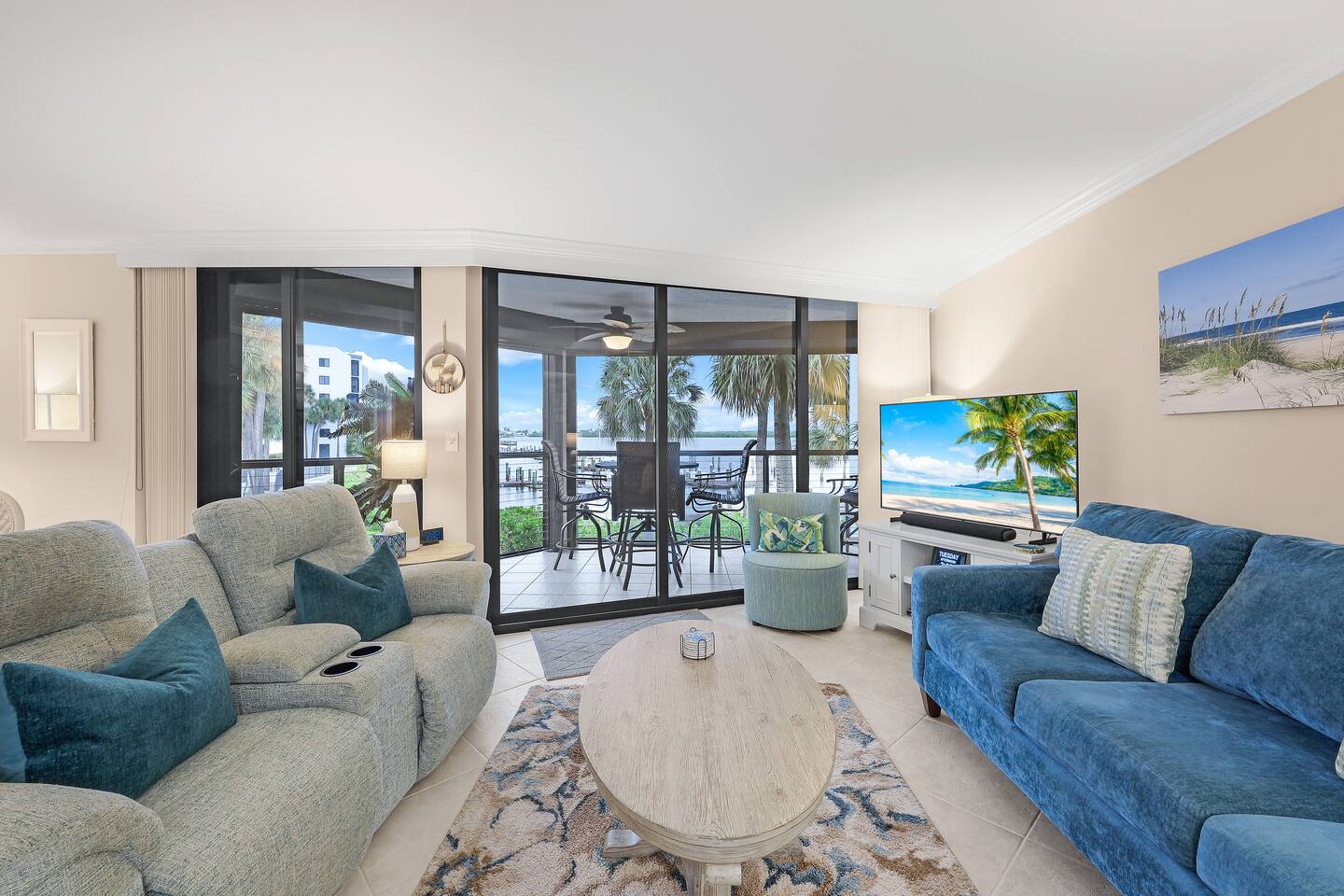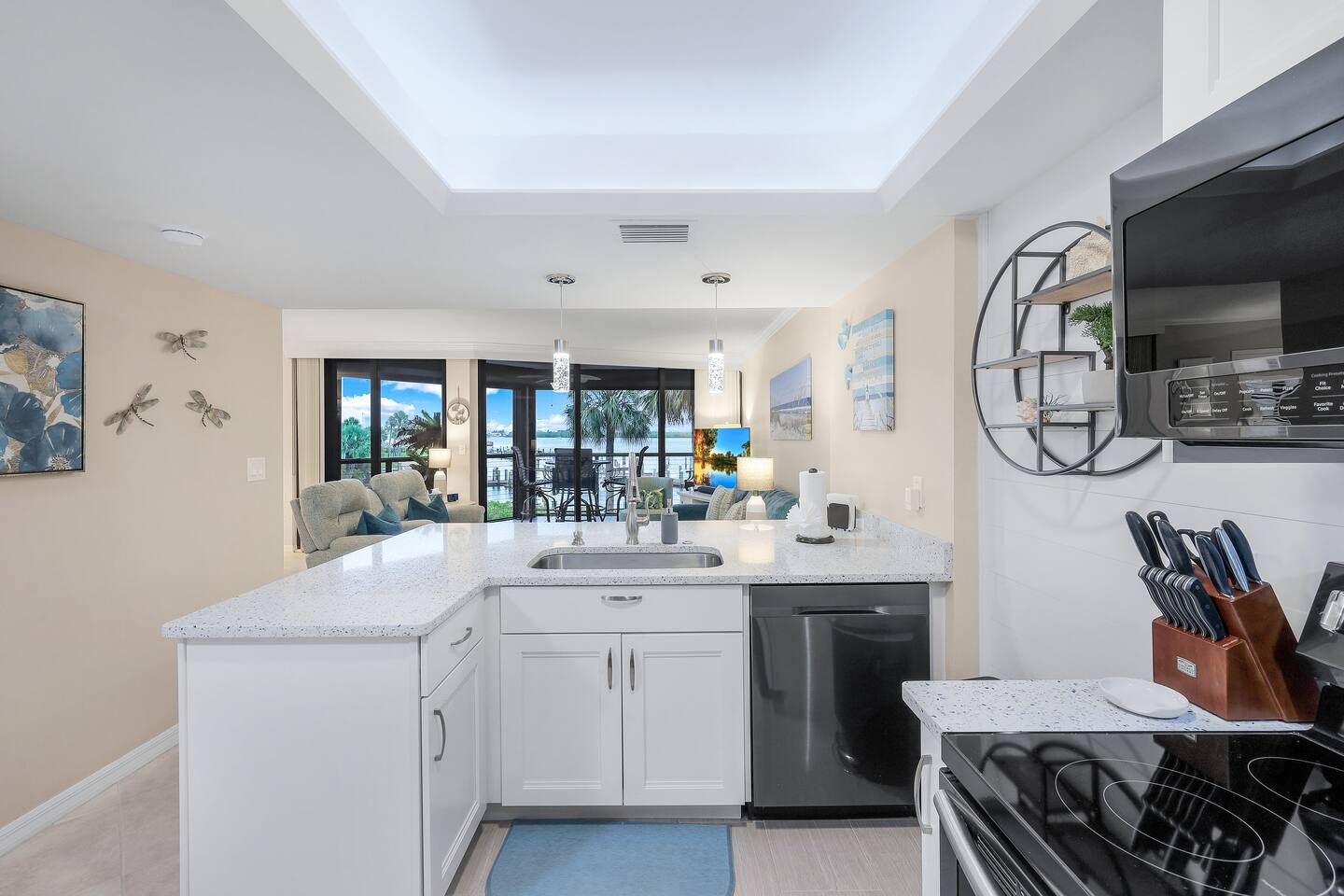 WHY GUESTS LOVE OUR SPACE: ✅ Rare 2 Full Bathrooms: Perfect for extra privacy and getting ready faster. ✅ Sleeps 4 Comfortably: King Memory Foam Bed + Twin Daybed w/ Trundle. ✅ The "Beach Kit": We provide 4 chairs, umbrella, towels, and coolers with ice packs. ✅ Chef's Kitchen: Fully stocked with an Air Fryer, Crockpot, and a stocked coffee bar. ✅ Resort Amenities: 2 heated pools, 2 hot tubs, tennis/pickleball, and BBQ grills. The living area flows seamlessly onto a screened lanai with a triple slider, offering breathtaking water views perfect for morning coffee or an evening cocktail. The condo comfortably sleeps 4 guests. **Bedrooms & Bathrooms:** * Master Bedroom: King-size memory foam bed with luxury linens. * Cozy Nook: Twin daybed with a pull-out trundle, perfect for kids or extra guests. * Two full bathrooms with a hairdryer shampoo, conditioner, and body wash. **Kitchen & Dining:** * Fully renovated dream kitchen with every appliance you might need. * Includes an air-fryer, crock pot and much more. * Dining area seats four. * Full coffee bar stocked with a Keurig machine full pot & single serve coffee, K-cups, creamers, and sweeteners. **Amenities & Entertainment:** * In-unit washer and dryer with laundry supplies. * Beach Gear: 4 chairs, an umbrella, towels, and coolers with ice packs. * Sports Gear: Pickleball paddles and tennis racquets for use on the property courts. * Entertainment: Board games, books, ultra high-speed Wi-Fi, and three Smart TVs with a full DirecTV cable package.