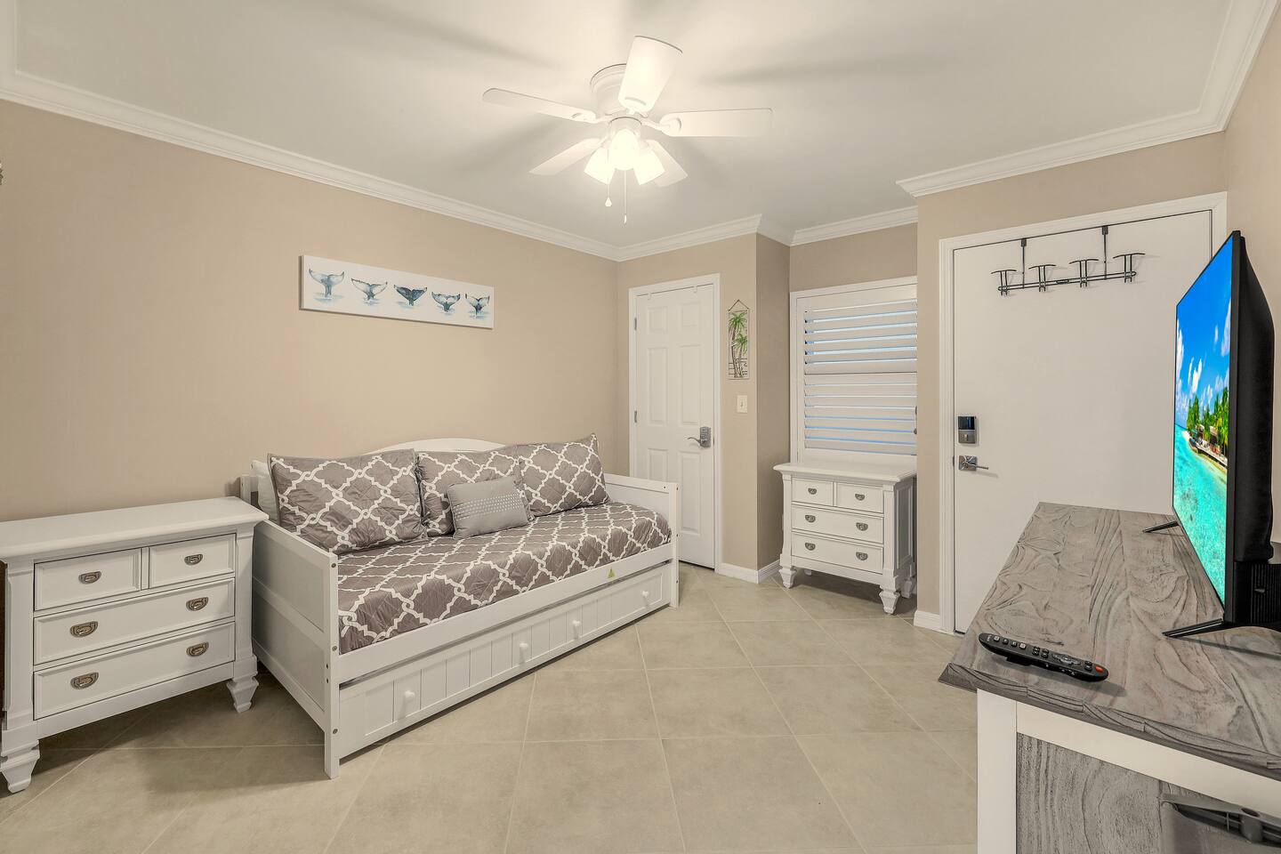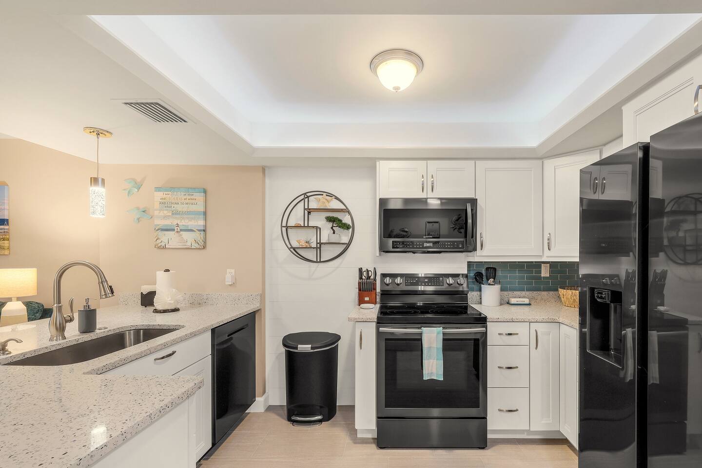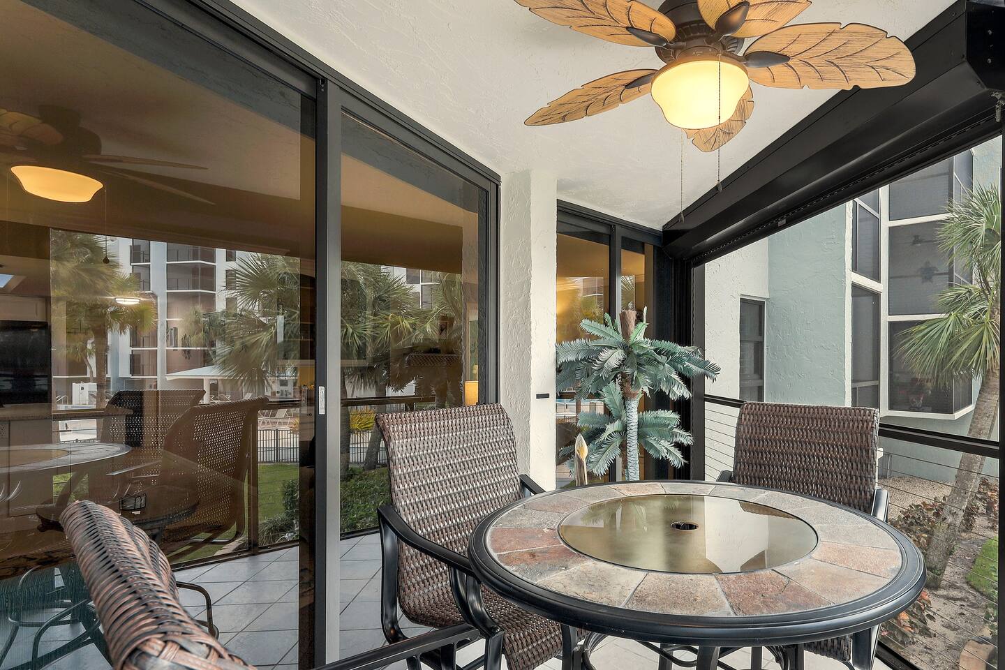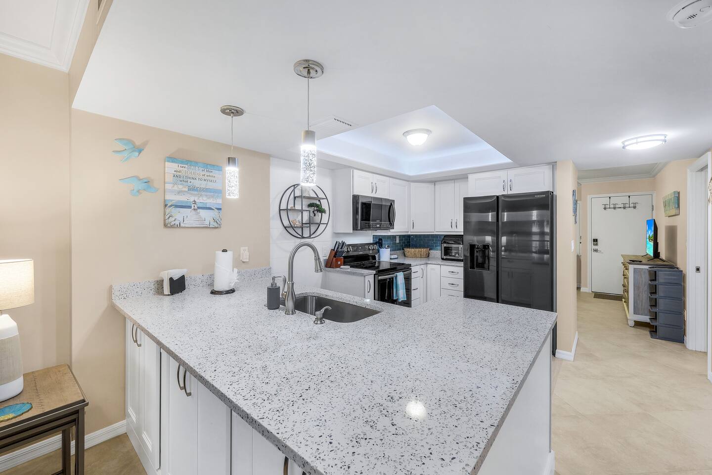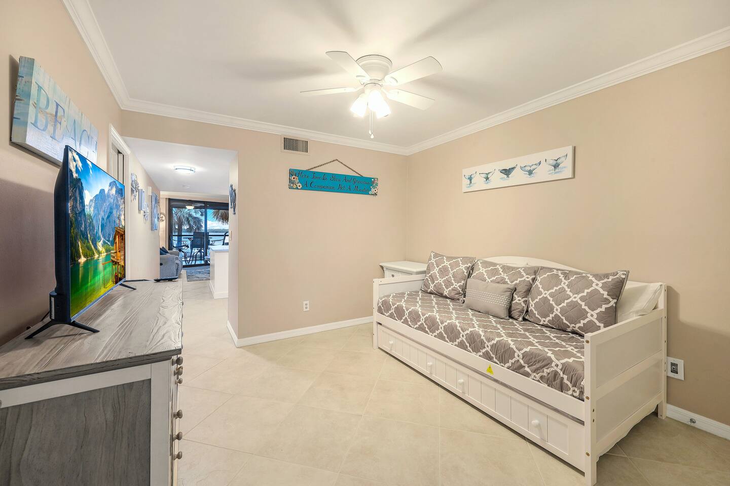 WHY GUESTS LOVE OUR SPACE: ✅ Rare 2 Full Bathrooms: Perfect for extra privacy and getting ready faster. ✅ Sleeps 4 Comfortably: King Memory Foam Bed + Twin Daybed w/ Trundle. ✅ The "Beach Kit": We provide 4 chairs, umbrella, towels, and coolers with ice packs. ✅ Chef's Kitchen: Fully stocked with an Air Fryer, Crockpot, and a stocked coffee bar. ✅ Resort Amenities: 2 heated pools, 2 hot tubs, tennis/pickleball, and BBQ grills. The living area flows seamlessly onto a screened lanai with a triple slider, offering breathtaking water views perfect for morning coffee or an evening cocktail. The condo comfortably sleeps 4 guests. **Bedrooms & Bathrooms:** * Master Bedroom: King-size memory foam bed with luxury linens. * Cozy Nook: Twin daybed with a pull-out trundle, perfect for kids or extra guests. * Two full bathrooms with a hairdryer shampoo, conditioner, and body wash. **Kitchen & Dining:** * Fully renovated dream kitchen with every appliance you might need. * Includes an air-fryer, crock pot and much more. * Dining area seats four. * Full coffee bar stocked with a Keurig machine full pot & single serve coffee, K-cups, creamers, and sweeteners. **Amenities & Entertainment:** * In-unit washer and dryer with laundry supplies. * Beach Gear: 4 chairs, an umbrella, towels, and coolers with ice packs. * Sports Gear: Pickleball paddles and tennis racquets for use on the property courts. * Entertainment: Board games, books, ultra high-speed Wi-Fi, and three Smart TVs with a full DirecTV cable package.
